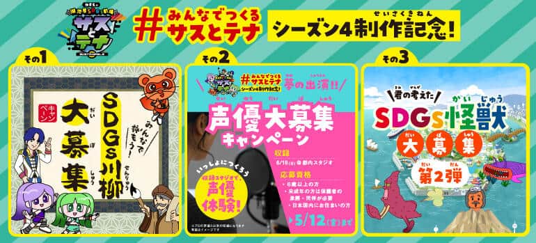 湖池屋(東京都板橋区)は、2023年7月から放映予定のアニメ「湖池屋SDGs劇場『サスとテナ』」新シリーズ・シーズン4の「アニメ内で紹介される川柳/アニメにご出演いただく声優/アニメ内で紹介されるSDGs怪獣」を2023年4月10日から募集を開始した。