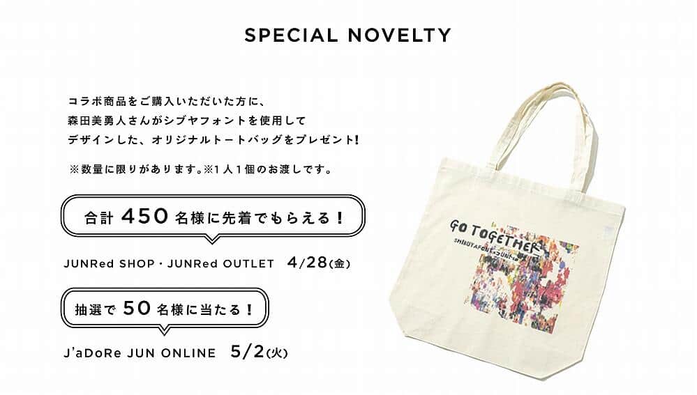 コラボアイテムを購入した人を対象に、オリジナルトートバッグをプレゼント。JUNRed直営店舗、JUNRed取り扱いアウトレット店舗では、先着順で4月28日から実施。公式ECサイトでは、抽選で当たる。