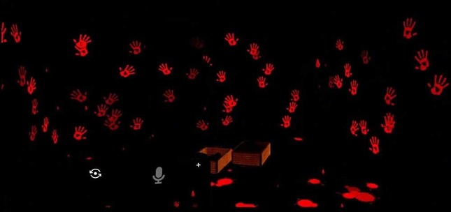 手蜀を持って外のエリアを進むと、文字が黒く塗りつぶされた墓石が置かれており、うめき声が聞こえてくる。墓を通り過ぎると、突然、目の前に人の姿が。よく見るとここには鏡のギミックが設置されており、自分のアバターが映っただけだと気付く。安心して家の方を振り返ると...。