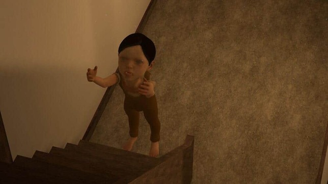 階段を降りようとすると、1階の床で、子どもの幽霊がこちらに手を伸ばして待ち構えている。近づくと消失するが、1階は薄暗く各所で怪奇現象の起きる空間に変わり果てている。
