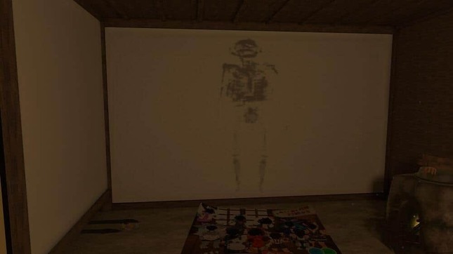2階奥には、大量の札が貼られた木製の壁がある。手前に置かれた棚と壁の間を進むと、向こう側へ通れる。そこはまたも真っ暗な空間。床に、ポツンと木箱がある。VRコントローラーを向けると、「開けるな」とのコマンドが表示される。