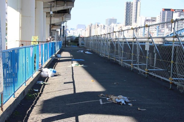 公園内に入ると、花火鑑賞に使われたとおぼしきビニールシートやガムテープ、中身の入ったままのペットボトル、空き缶が散乱している。川沿いの通路に至るまで、無数に広がる。マッチョたちの出番だ。