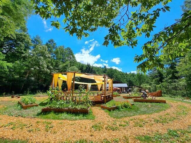 植物の水やりに使うための雨水を貯めるエリア、野菜のヘタや枯葉などを堆肥に生まれ変わらせるエリア、ハーブや野菜などの収穫エリアなど、植物を中心に食の循環・森の循環を学べる体験型スポット。