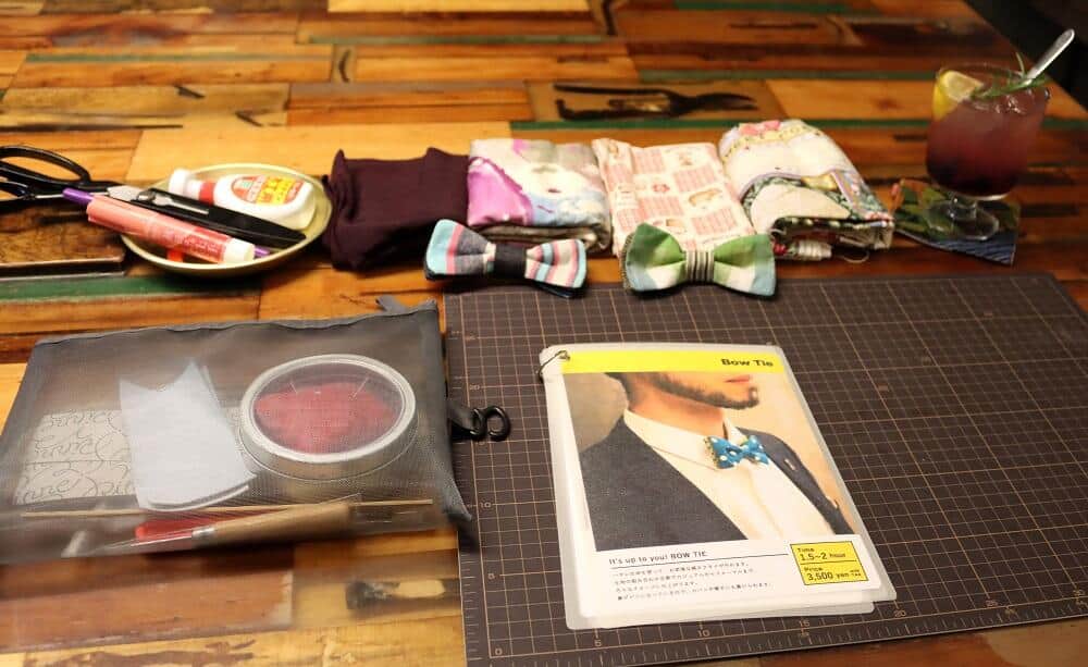 記者は「bar PROJECT MENU」(税込3850円)を注文。ハギレ生地を使って蝶ネクタイを作る、「Bow Tie」に挑戦した。メニューの中で、縫う工程が唯一あるものだ。男女問わず人気だという。