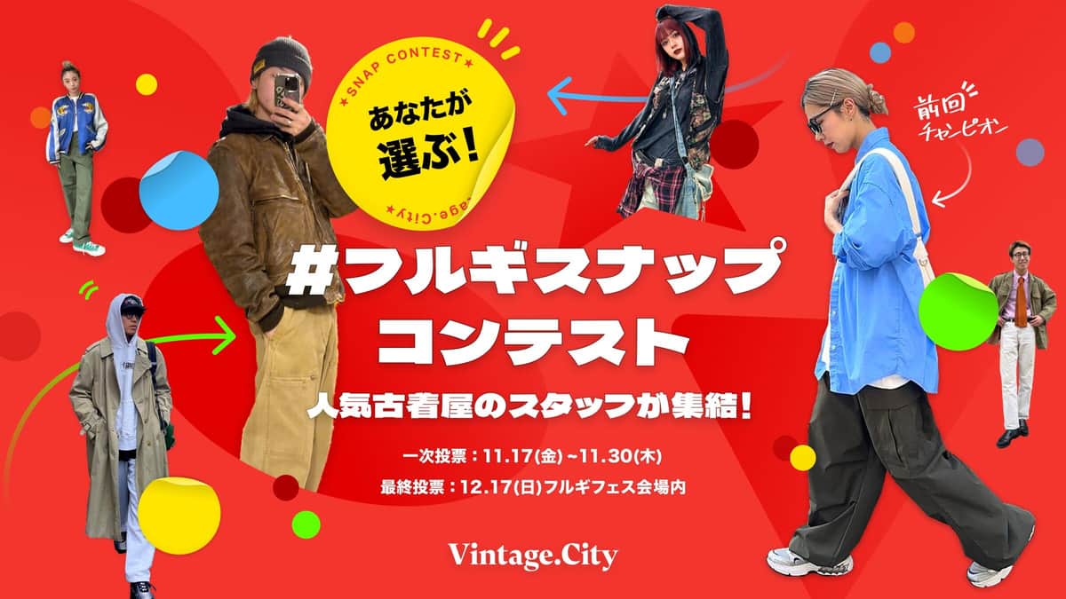 同アプリに実装されたスナップ機能内で、期間中にアップされたコーデが対象だ。アプリ内で投票を行い、ランキング形式で競う。その中の、ランキング上位10人が、12月17日に東京ビッグサイトで開催される「フルギフェスwith Vintage.City」で、来場者による最終投票および表彰式を行う。