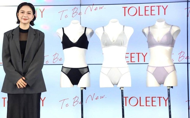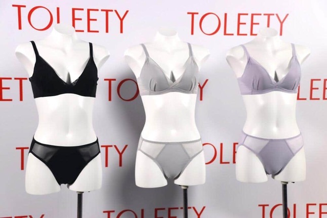 「TOLEETY」から6月24日に発売したのは、「軽やかストレスフリーブラ」だ。村重さんによるとノンワイヤーで、固いパーツを取り除き、伸縮性があるという。長時間着けていても楽で、27グラムという軽さで肩の負担がないのが特徴だと説明した。洗濯タグを直接ブラに印字しているため、タグが地肌をこする痛みを感じないとのこと。
