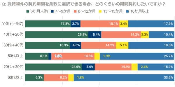 そこからは、全体の36.6%、とりわけ20代以下の47.4%は賃貸契約期間を「12か月未満」という柔軟な契約を望む傾向がよみとれる。