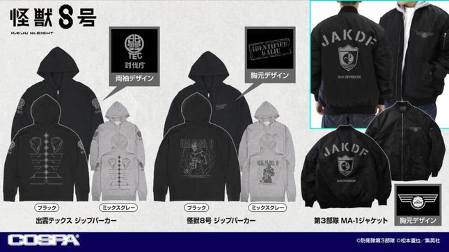 キャラクターグッズなどを手がけるコスパ(東京都渋谷区)は、アニメ「怪獣8号」デザインのアパレル各種の予約受付を、2024年7月30日~8月25日までの期間、同社直販サイト「COSPA inc.」で行っている。発送は10月中旬の予定。