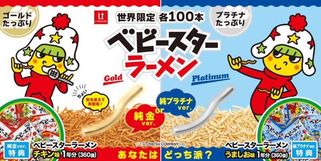 23年発売の「純金製 ベビースターラーメン」がリニューアル。純金製に加え純プラチナ製の2種類を用意する。