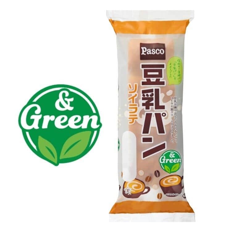 豆乳を練り込んだやわらかいパンで、ソイラテ風クリームをはさんでいる。包材には、一部、植物由来の原料を使用。