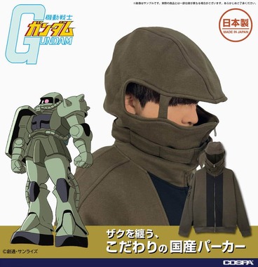 同作に登場するジオン公国軍のモビルスーツ(MS)「ザクII」がモチーフ。着用してフードをかぶれば同MSのようになれる、生地や縫製にもこだわった国内生産品となっている。