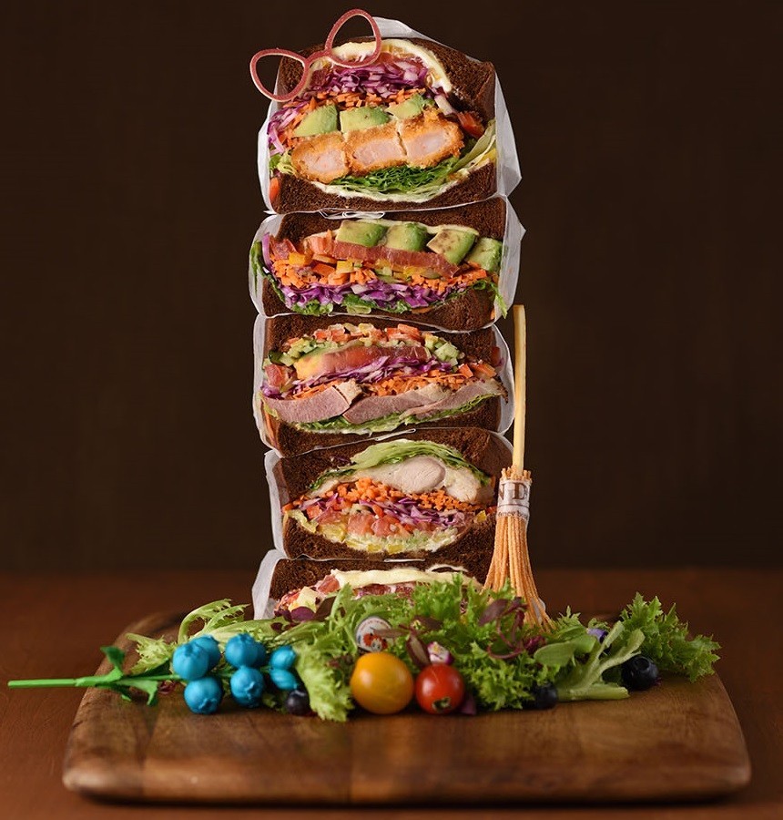 目玉メニューは、ボリューミーで野菜たっぷりのサンドイッチを5段重ねにした「ガーデンサンド5MAX」(税別5980円)。「メアリと魔女の花」の主人公メアリが訪れる魔法大学「エンドア大学」をモチーフにしており、作中に登場するマダムのめがねや、キーアイテムであるほうきが横に添えられている。