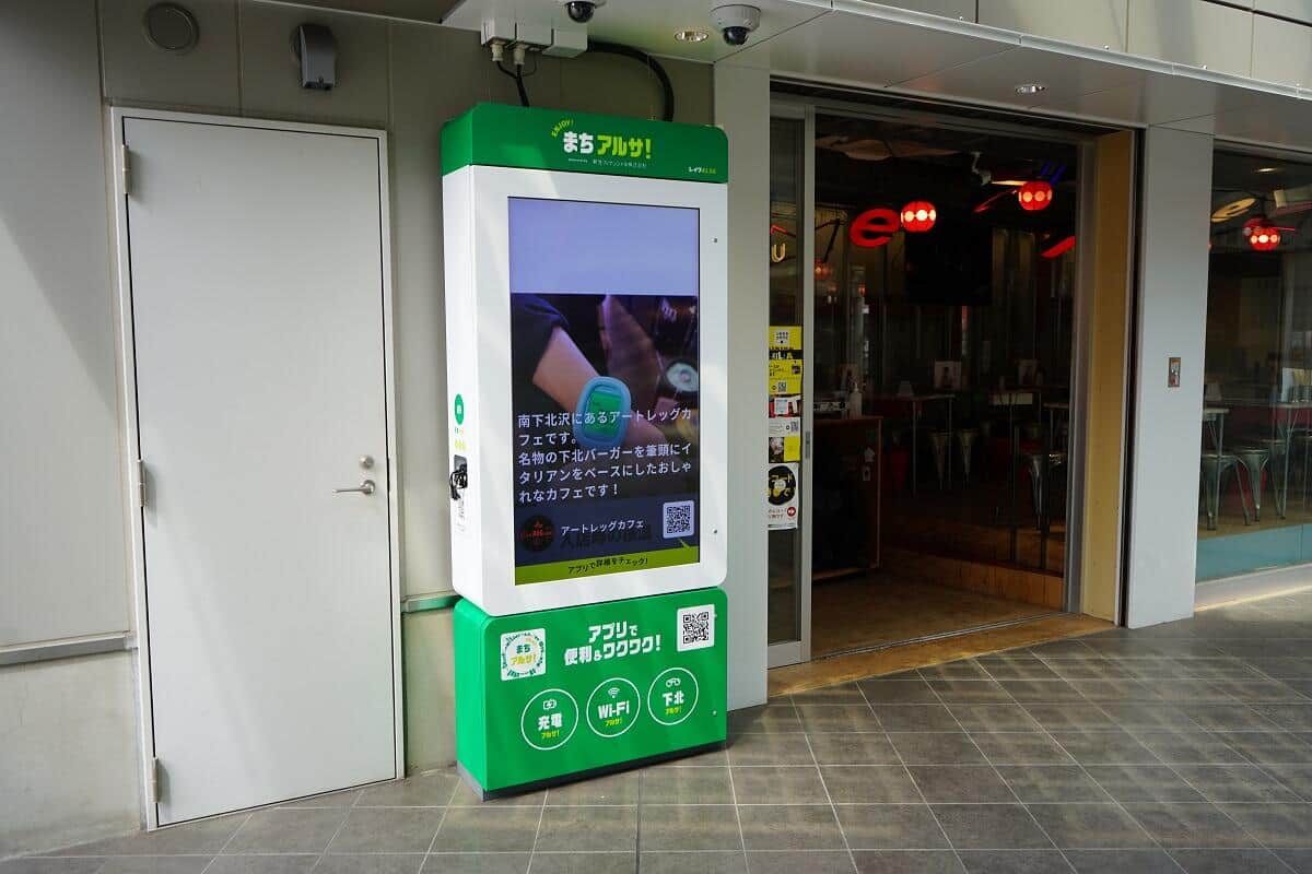 「まちアルサ!」で利用できるデジタルサイネージは、下北沢駅構内の商業施設「シモキタエキウエ」に設置されている。イベントや飲食店の空席状況、クーポンなど、下北沢に特化した最新情報に無料で触れることができる。