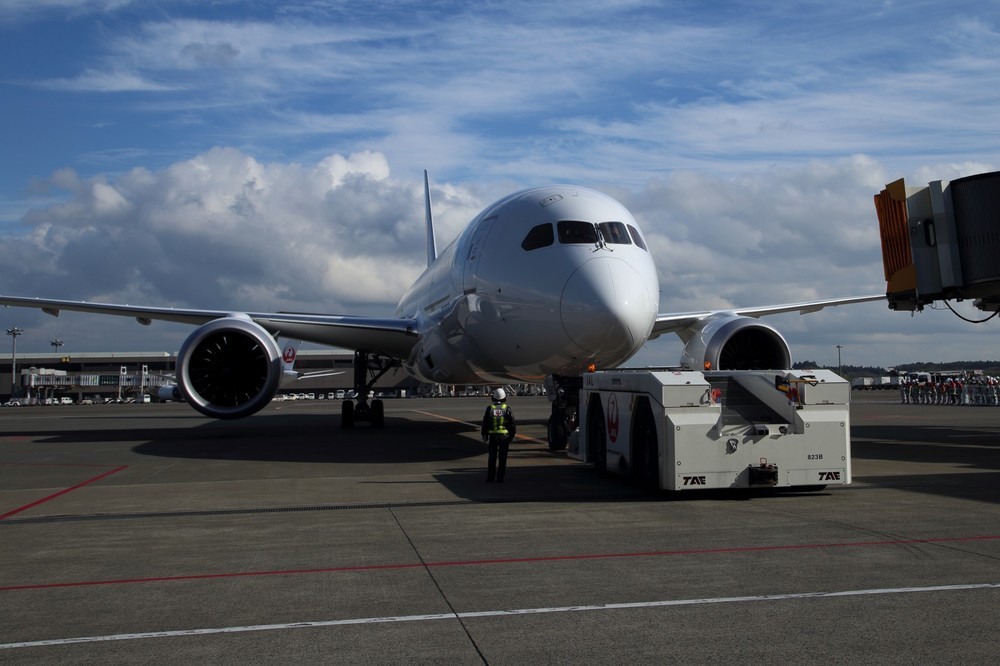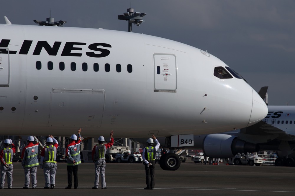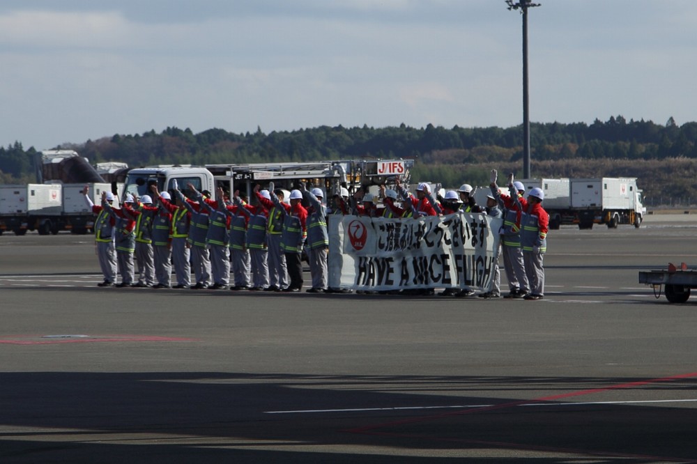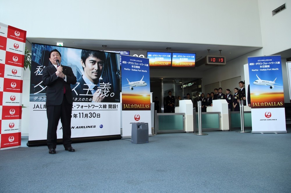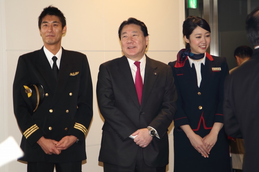 テープカットで路線再開を祝った。中央左が阿部寛さん、中央右がJALの植木義晴社長