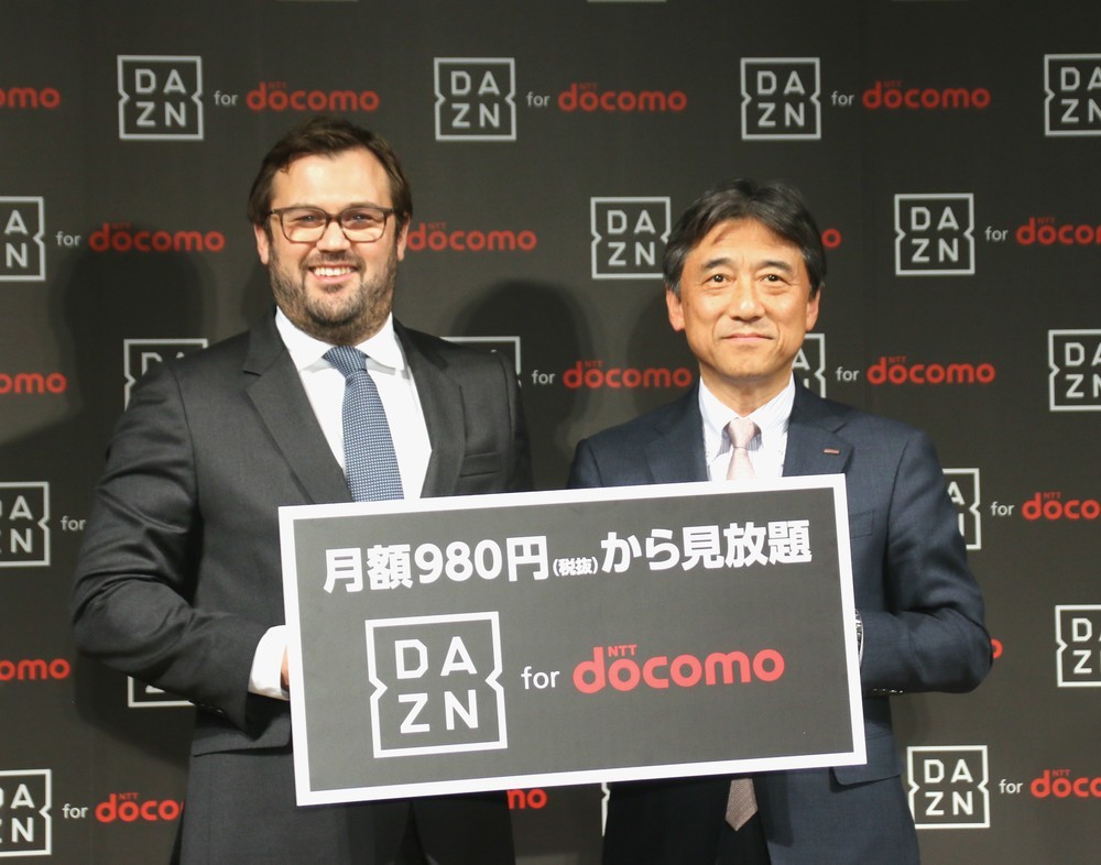 NTTドコモの吉澤和弘・代表取締役社長(右)とDAZNのジェームズ・ラシュトンCEO(2017年2月8日撮影)