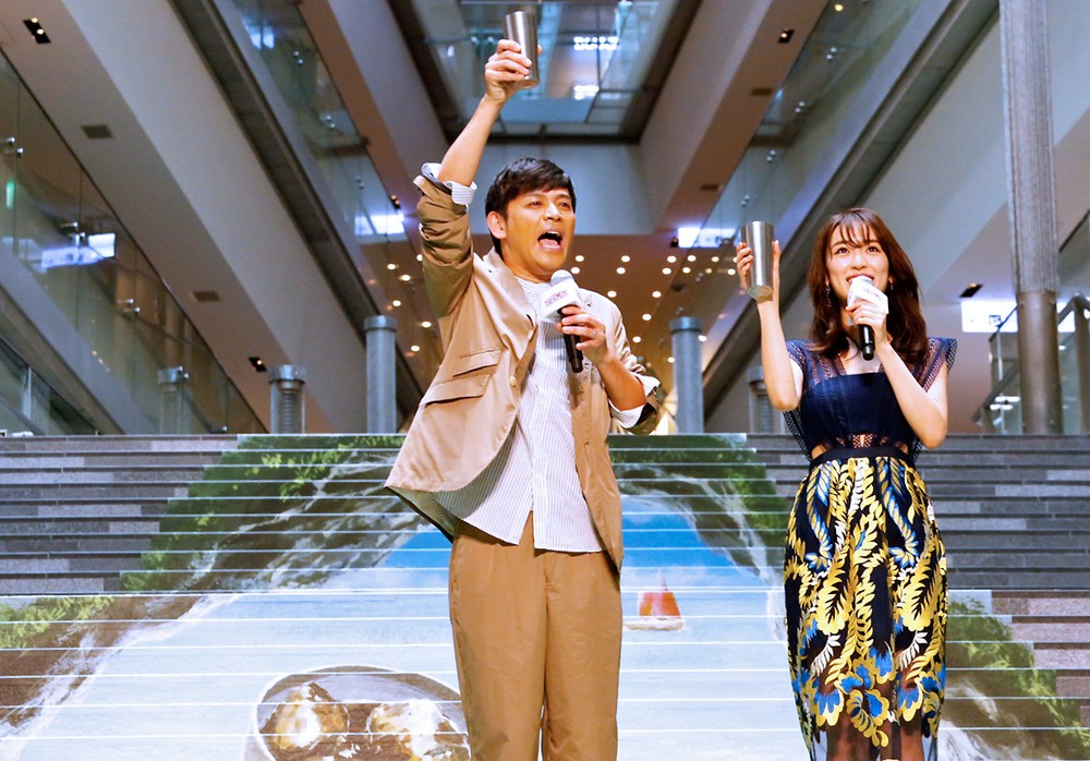 誰が仕掛けた!? 岡田圭右と泉里香、表参道ヒルズに出現した「だまし絵」にワァオ!