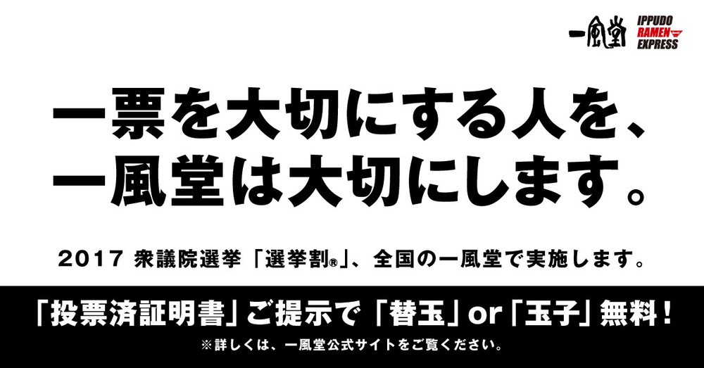 「替玉一玉」か「半熟塩玉子1個」がタダに! 一風堂の「選挙割」