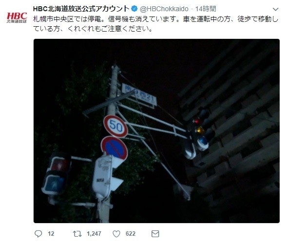 地震直後に札幌市中央区が停電 (画像はHBC北海道放送のツイッターより)