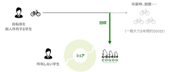 卒業時、大学に放置される自転車をCOGOOが学生から回収し、シェアサイクルへと転用