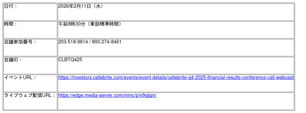 同日の午前中、Cellebriteはその後にライブの電話会議とウェブ配信を開催し、2025年第4四半期の決算結果を振り返って2026年の見通しについて説明します。関連情報は以下の通りです。