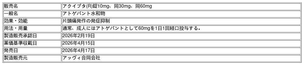 ー アクイプタは2026年2月に、成人の片頭痛患者さんに対する片頭痛発作の発症抑制に関して、国内における医薬品製造販売承認を取得