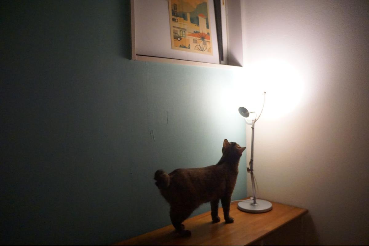 我が家の猫ちゃん。人間がいないのに、急に照明がついてびっくりしたみたい(笑)。