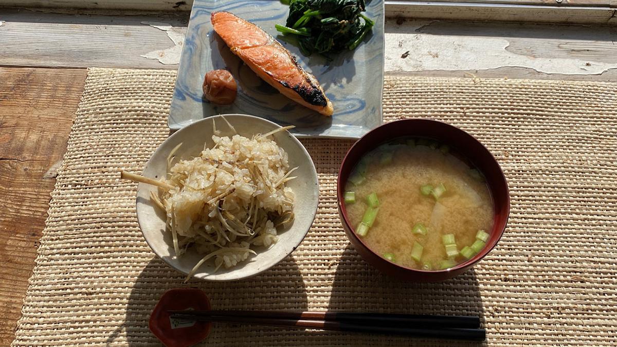 甘口塩鮭、ほうれん草のおひたし、牛蒡の炊き込みご飯、蕪の味噌汁、梅干し、