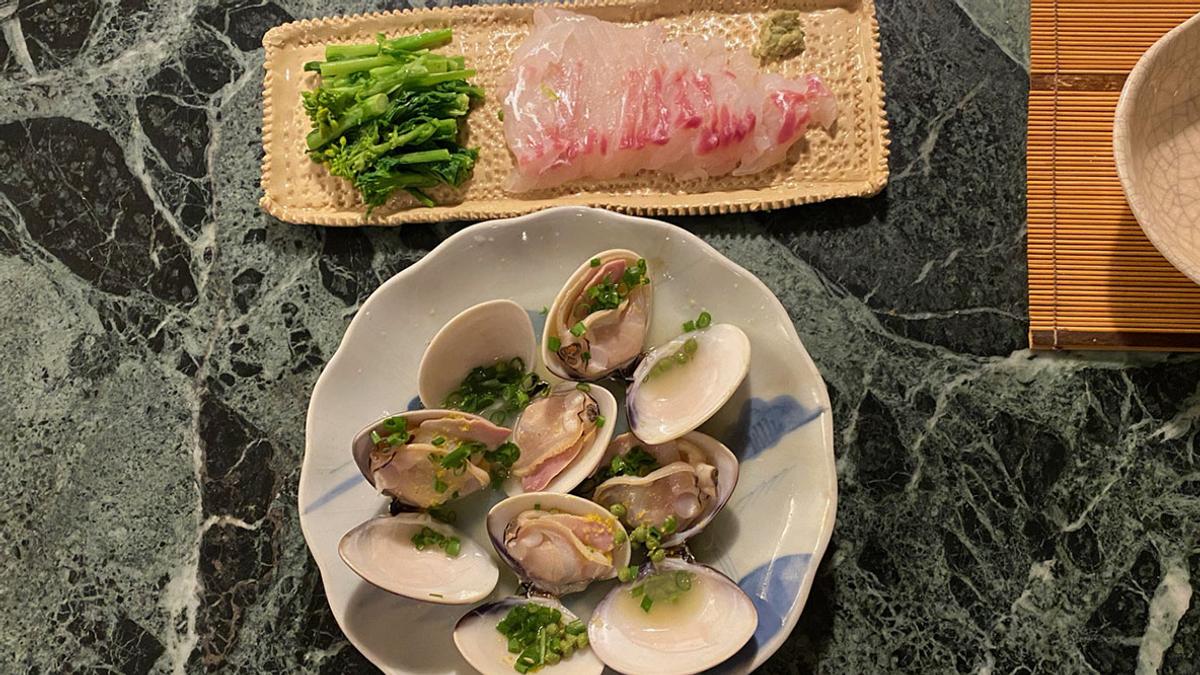 はまぐりの酒蒸し、真鯛の刺身と菜花。