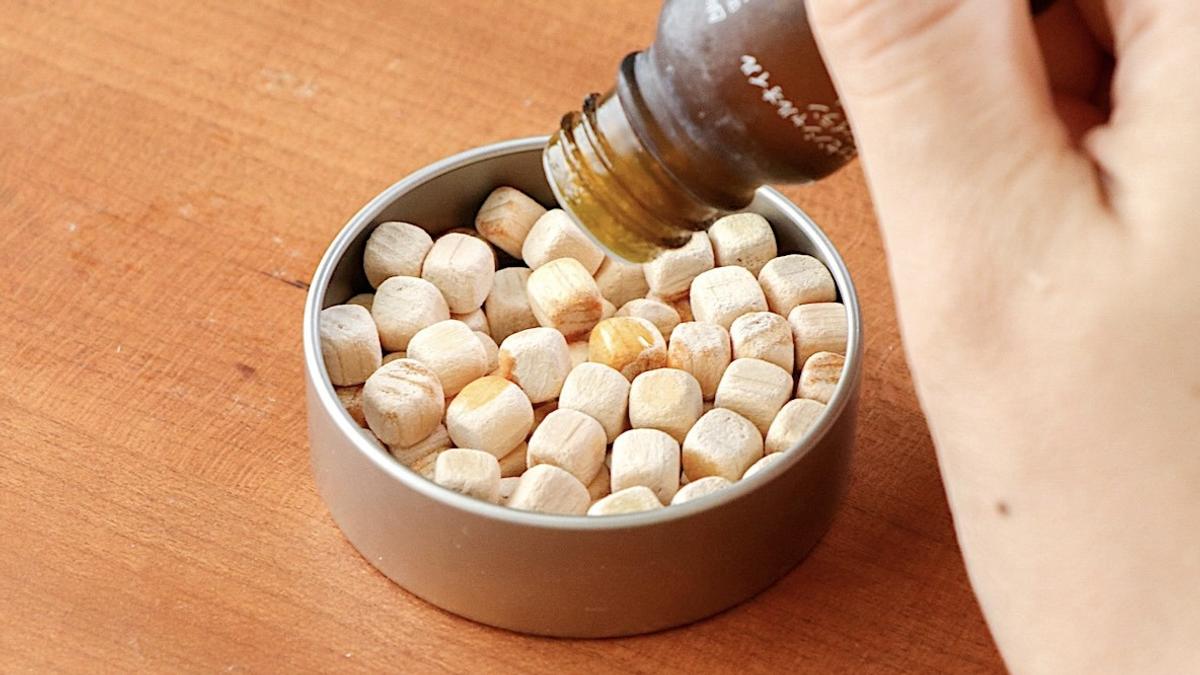 手のひらサイズの缶を開けると、中にはウッドチップのような小さな木片が。