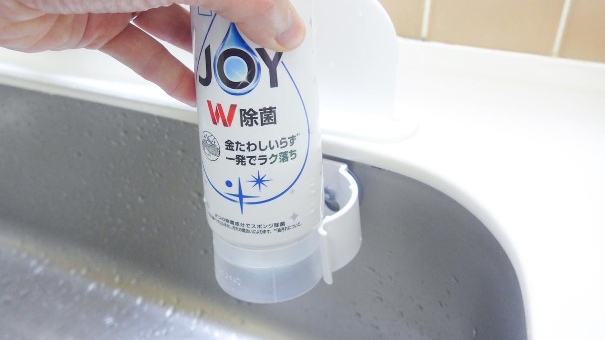 油汚れがひどいフライパンや鍋は、洗剤を直接かけて洗いたい派なので、ボトルを手前に引くだけてサッと外せるのは、思っていた以上に便利でした。
