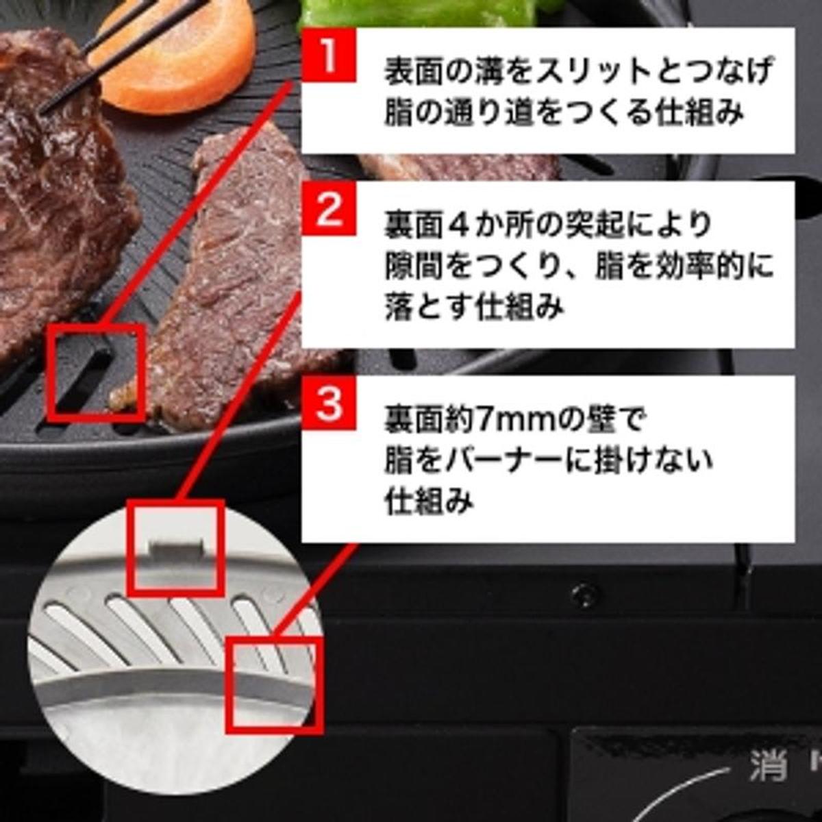 バーナーと焼き面に適度に熱がこもる構造にして、焼き面を約210~250℃にコントロール。プレートの温度を高温化させないことで脂の煙化を防ぎます。