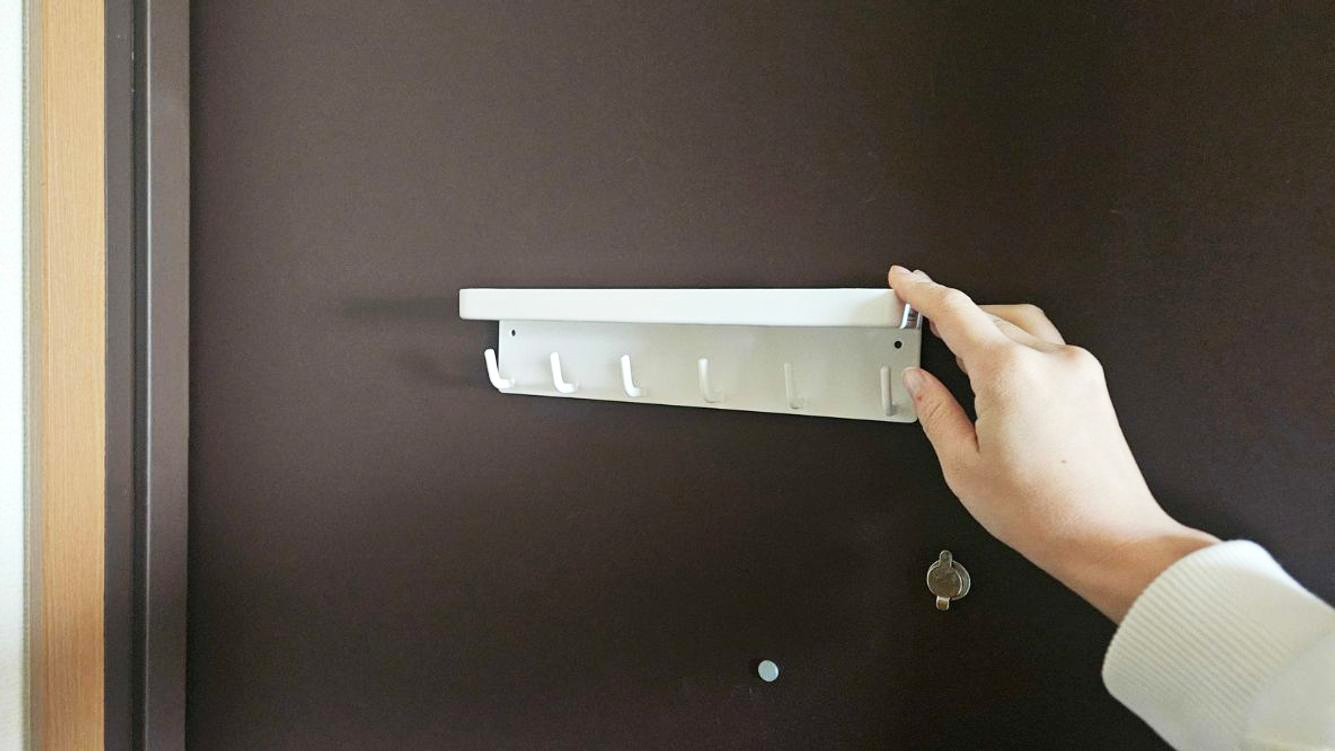 約W24.5×D4.5×H6cmでコンパクトな仕様。玄関ドアに取り付けても圧迫感は特になく、物もしっかり置くことができます。