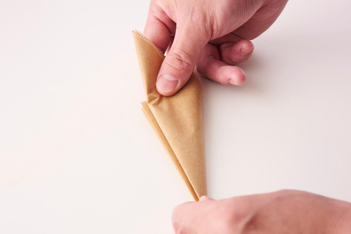POINT:落とし蓋はクッキングシートで作っても。鍋の大きさに合わせて切ったクッキングシートを四つ折りにし、さらに三角形に2回折ったら写真の4か所を切って完成。