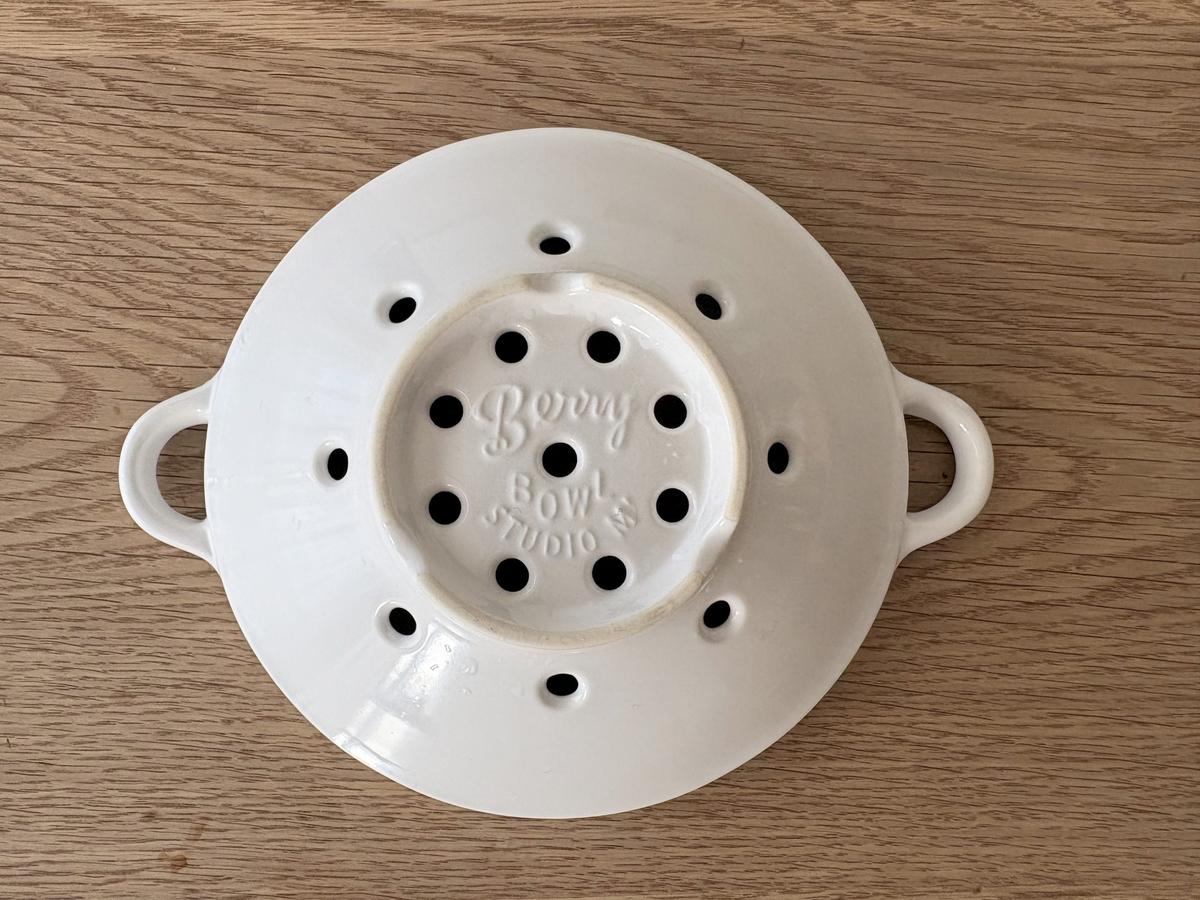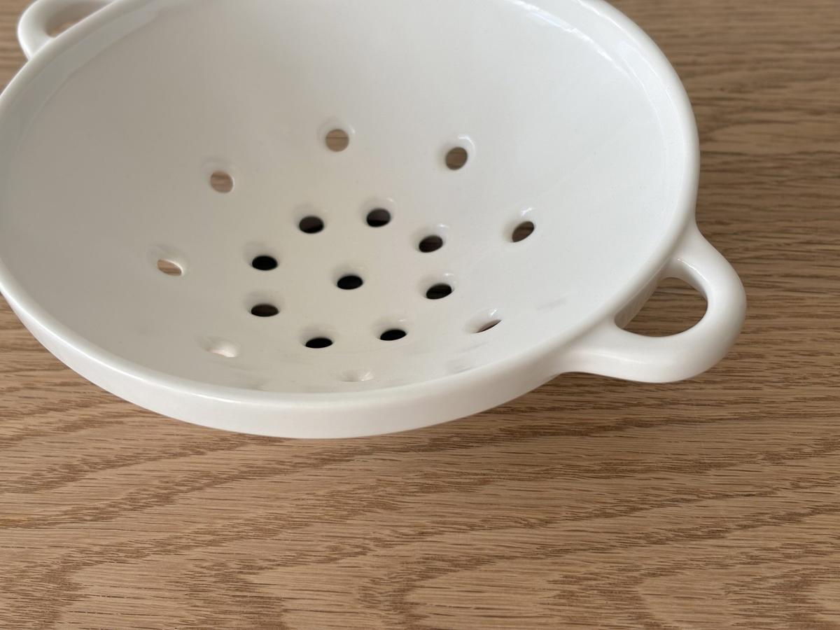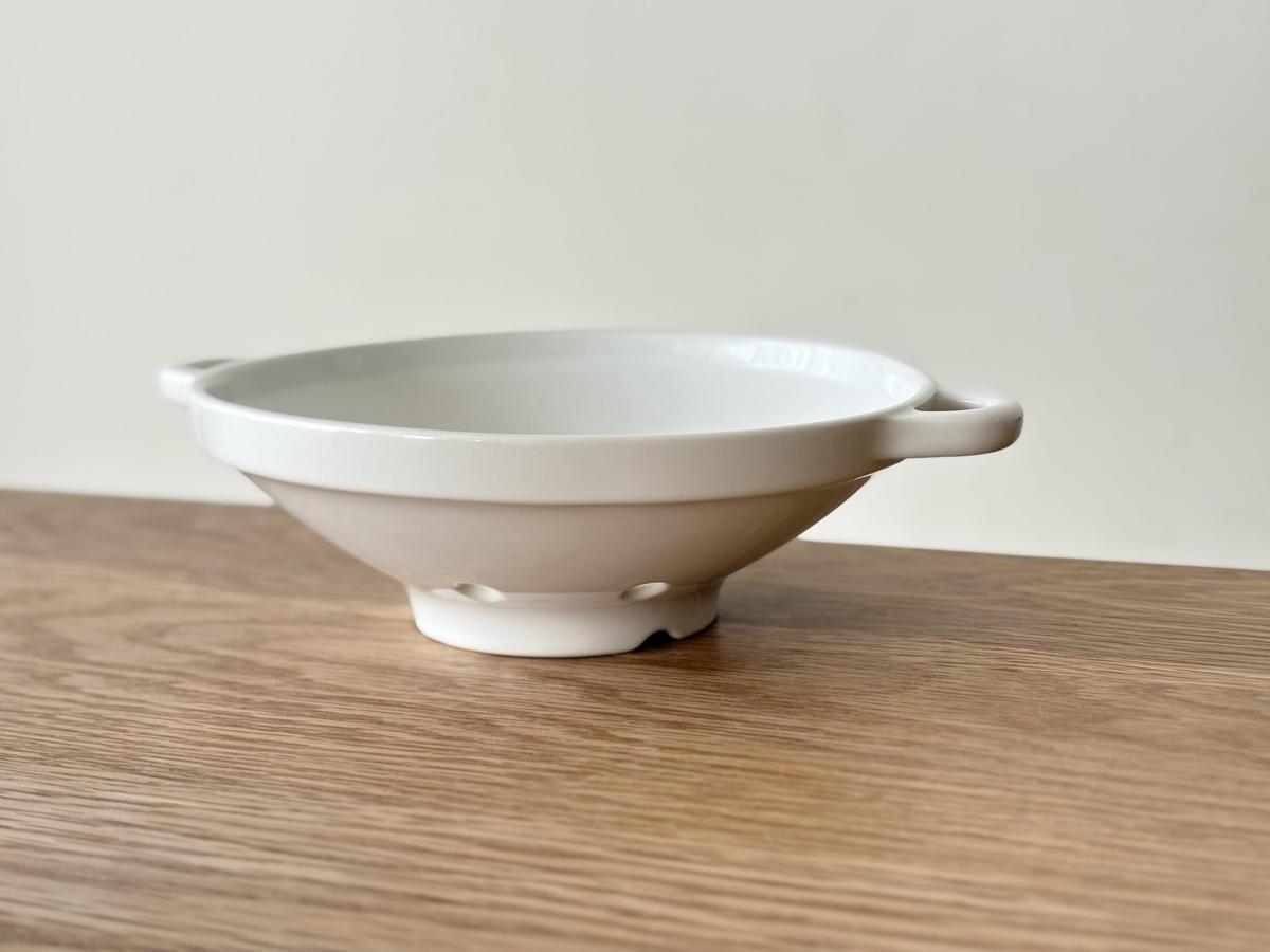 世の中のコランダーの素材は、ステンレスやホーロー、プラスチックなど様々あるようですが、この「ベリーボウル」は磁器製。
