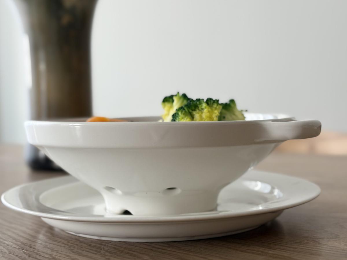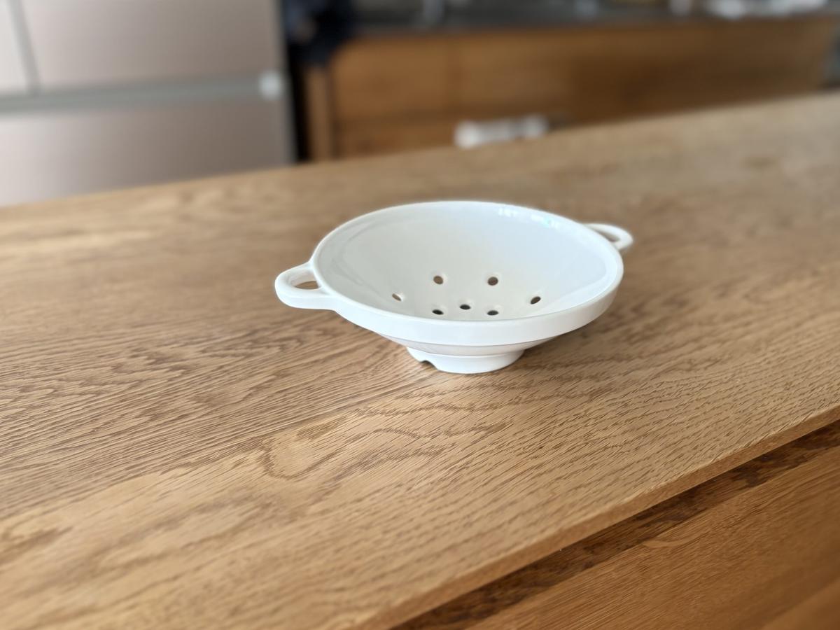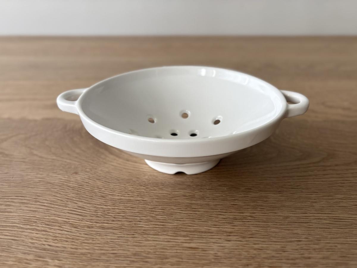世の中のコランダーの素材は、ステンレスやホーロー、プラスチックなど様々あるようですが、この「ベリーボウル」は磁器製。
