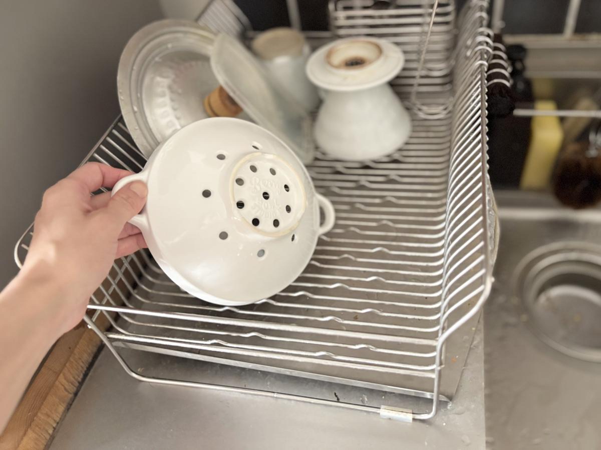 水切りザル(または水切りカゴ)の分類に入るのかもしれませんが、一般的な食器に使われる素材のため、ビジュアルは器寄りです。