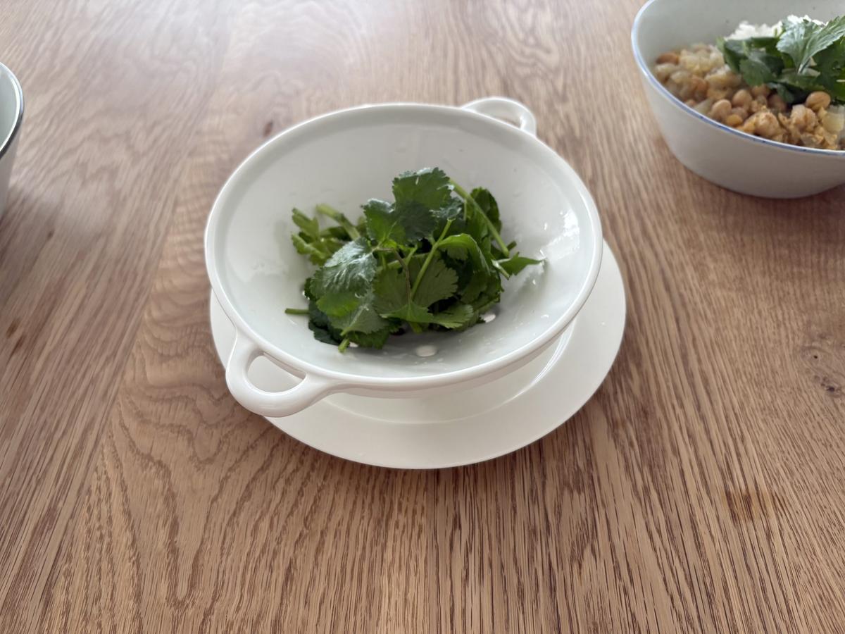 いちごやトマト以外にも、別盛りのパクチーをサッと洗ってお好みで。