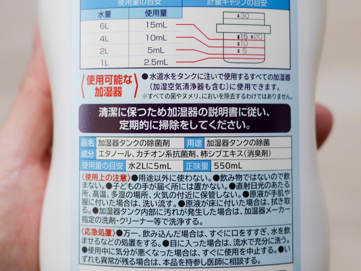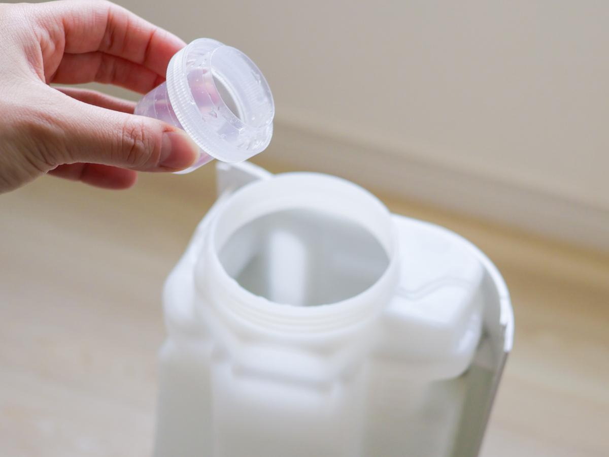 使う時は液体洗濯洗剤のように計量し、加湿器の水タンクに投入します。
