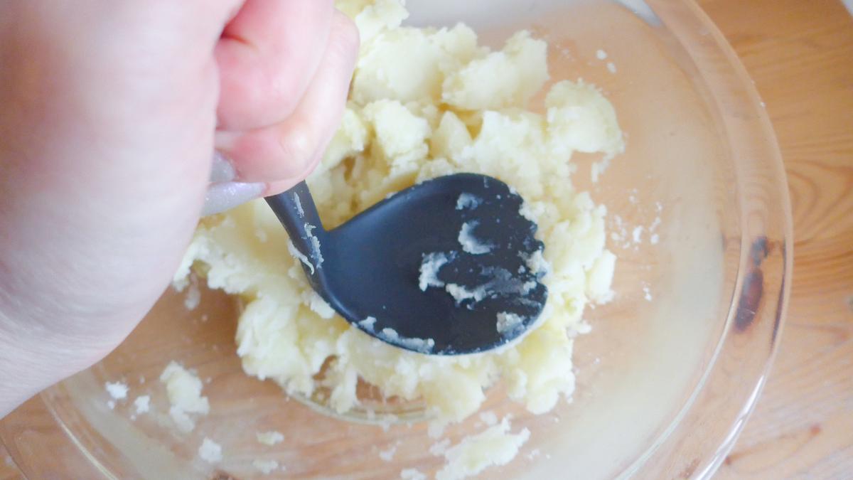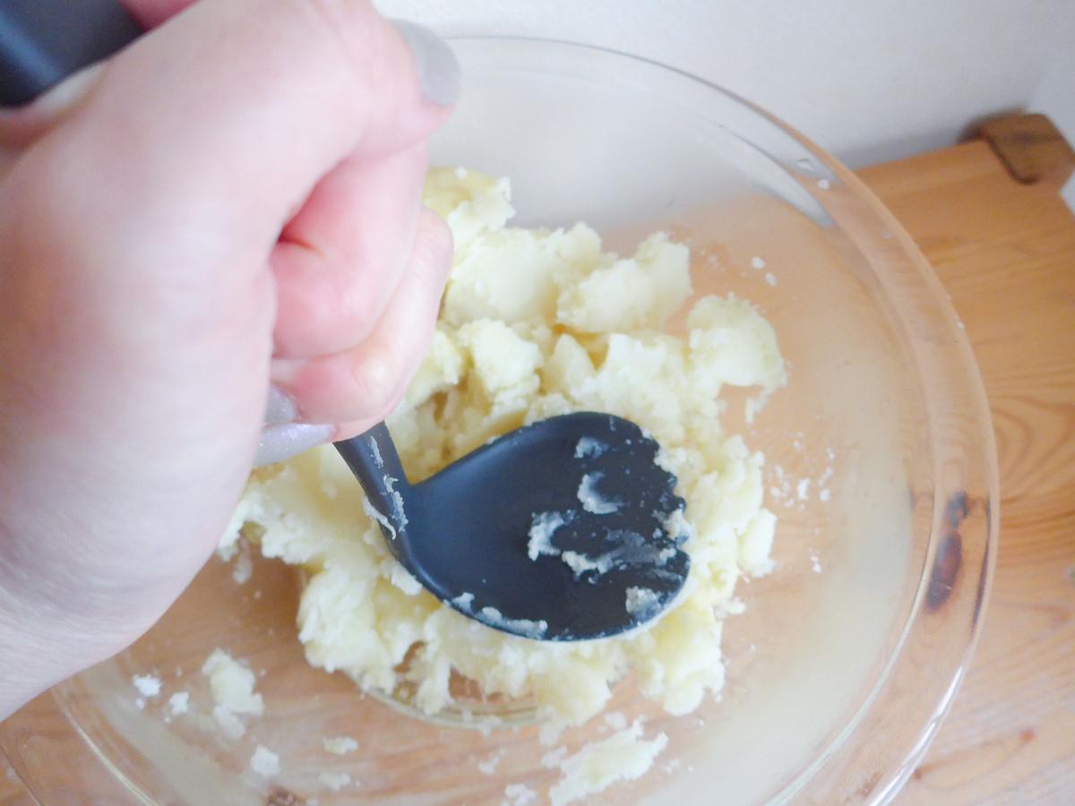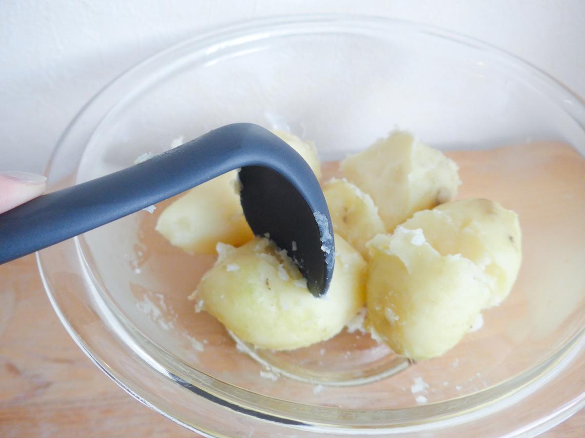まずは、ゆでたジャガイモに先端を当てて砕くところから。
