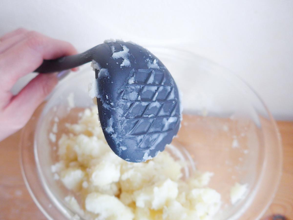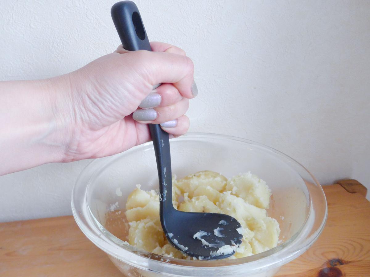 真上からぎゅっと押すと、驚くほどスムーズ。大きな力をかけなくても、ジャガイモがほろっと崩れていきました。