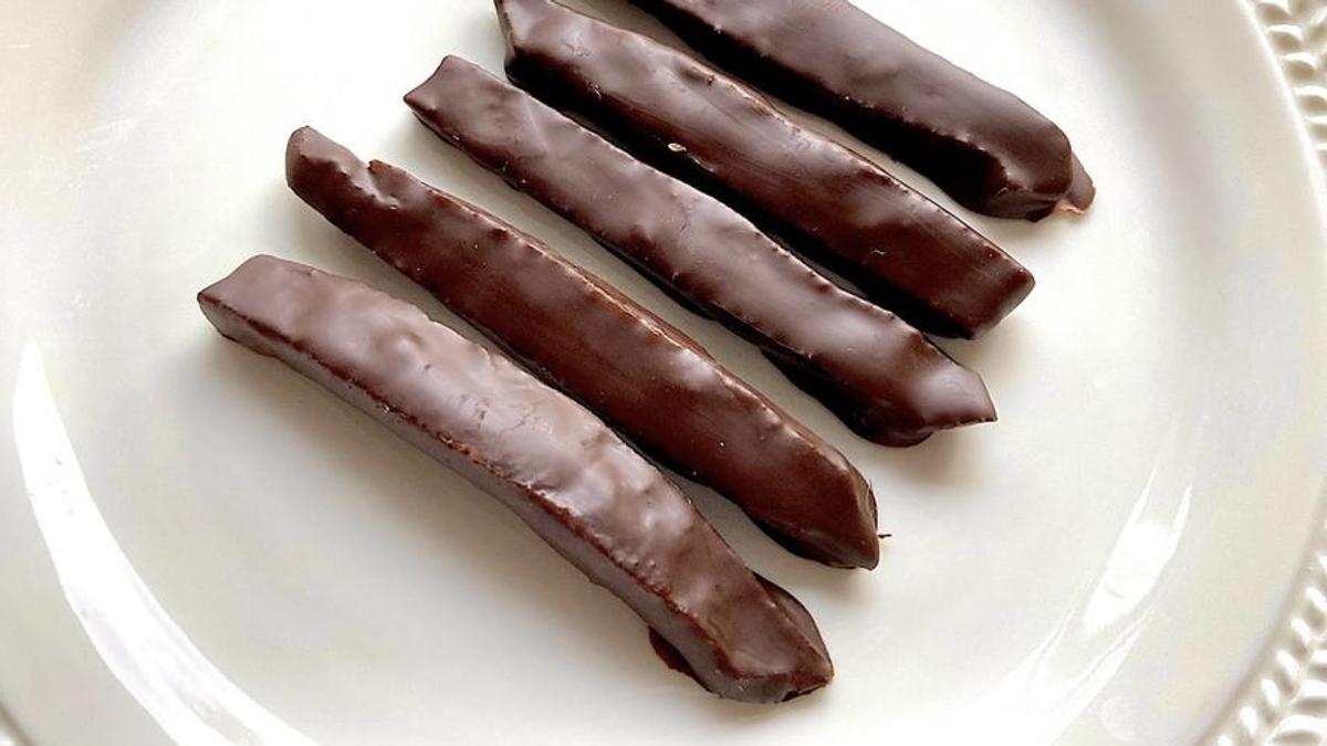 9. 火からおろしてよく冷ましたら、湯せんして溶かしたチョコレートにくぐらせて常温で固める。チョコレートは部分的につけてもOK。