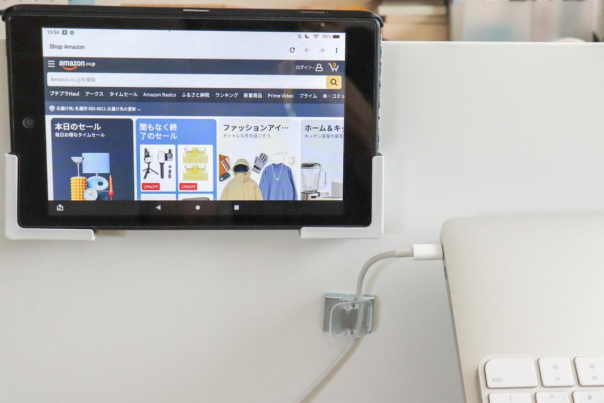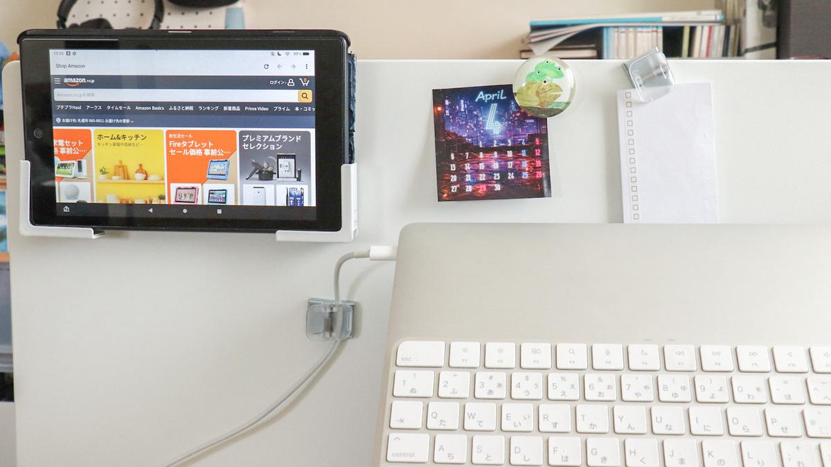 同じく山崎実業の「マグネットタブレットホルダー タワー」を組み合わせると、動画を流したり音楽をかけたりしながら作業ができるように。