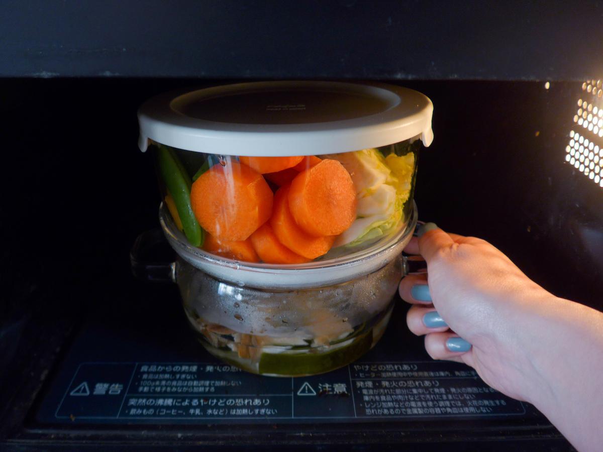 二段を重ねてレンジへ戻し、4〜5分半ほど加熱します。