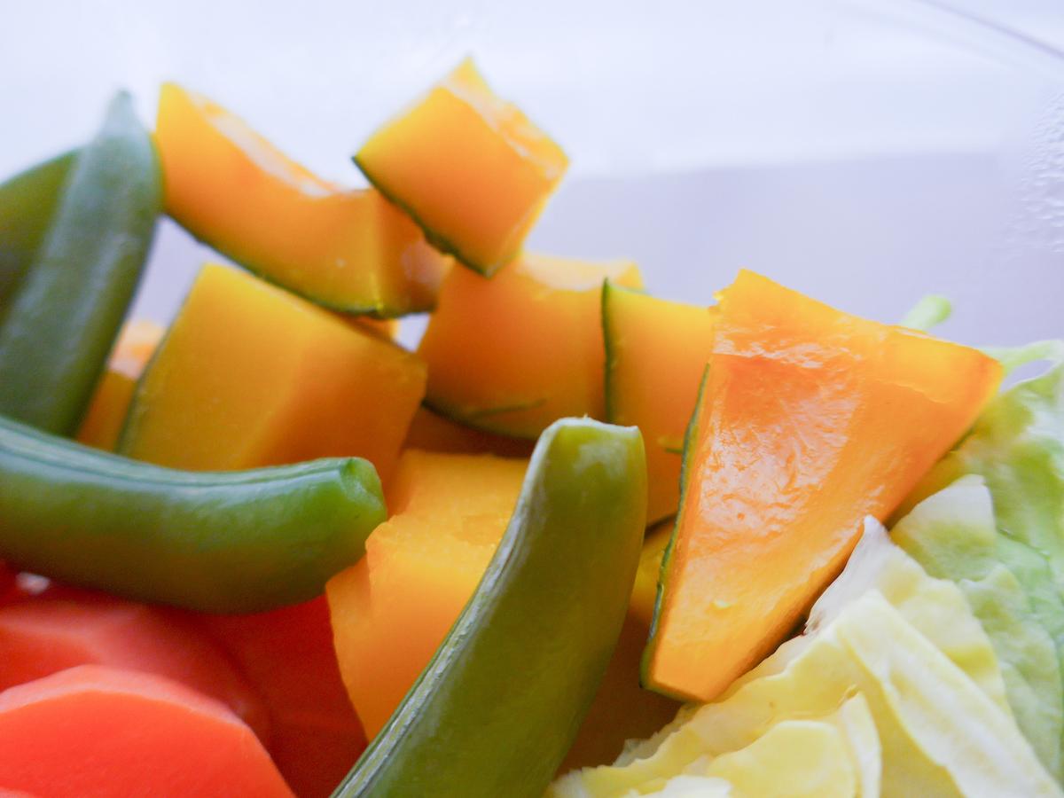 ほぼ蒸し器におまかせで手をかけた感覚がないのに、かぼちゃはほくほく、スナップえんどうはプチッといい歯ごたえ。加熱時間って、本当に重要なんだなぁ……。