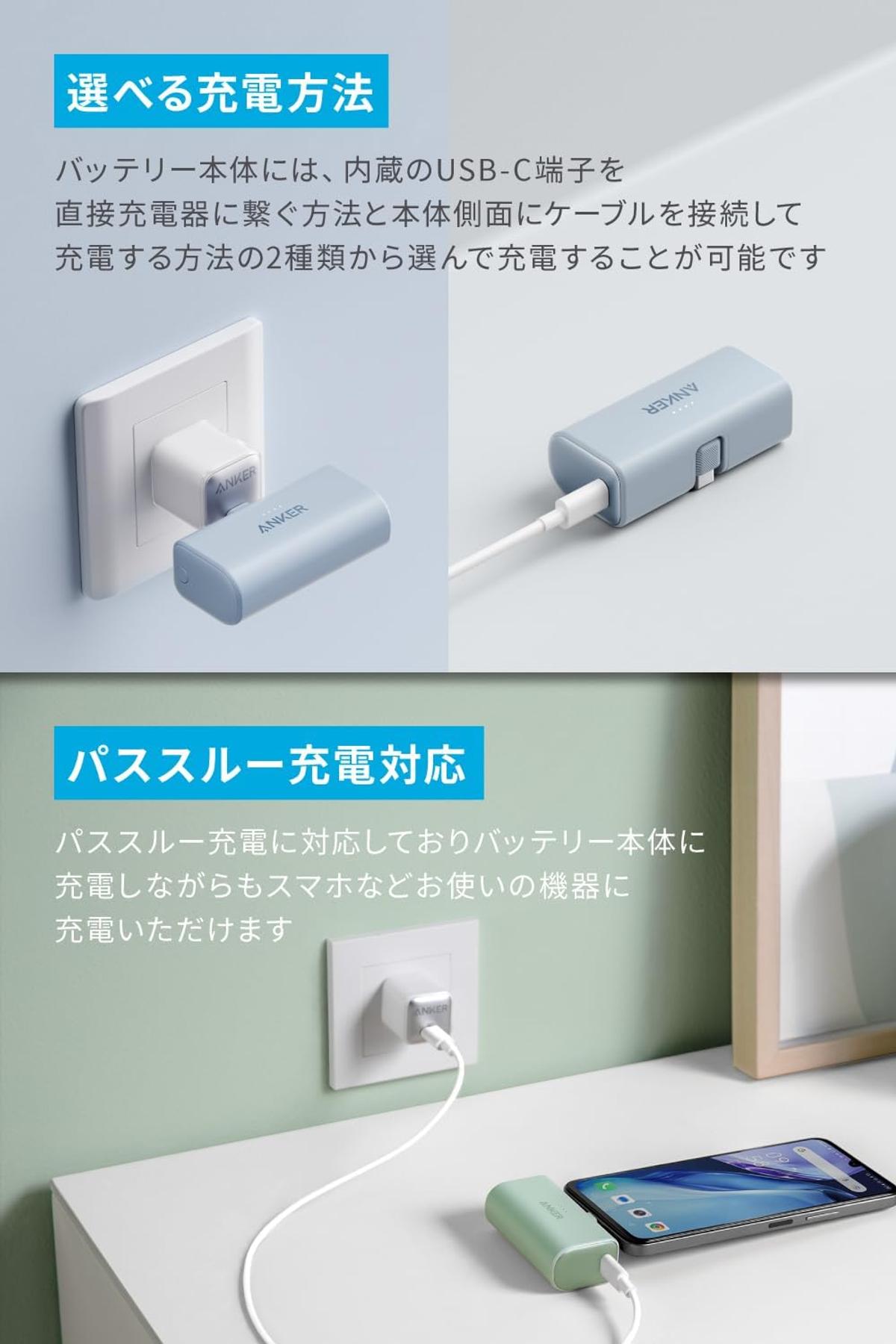 本体の充電方法も柔軟で、内蔵USB-C端子を直接充電器に挿す方法と、側面ポートにケーブルを接続する方法の2通りから選択可能。パススルー充電にも対応しているため、本体を充電しながらスマートフォンなどの機器を同時に充電できます。