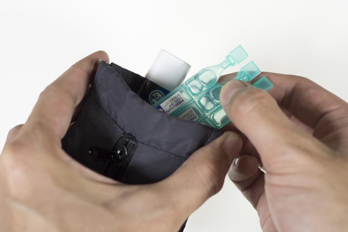 こちらには外出時に持ち歩きたいリップクリームや目薬を入れて。