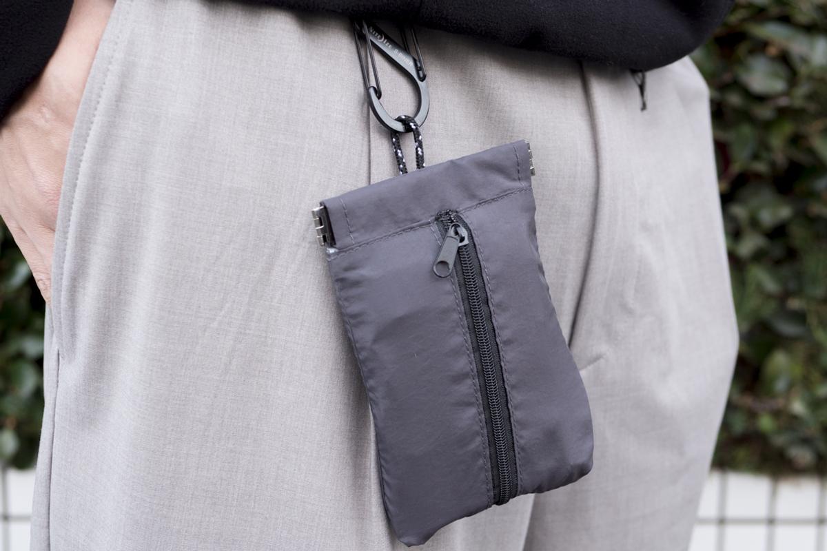 バッグやパンツに吊るして、ポケットティッシュ&ゴミ入れをサッと使えるようにしてくれるダイソーの「ポケットティッシュも入るユーティリティバネ口ポーチ」。