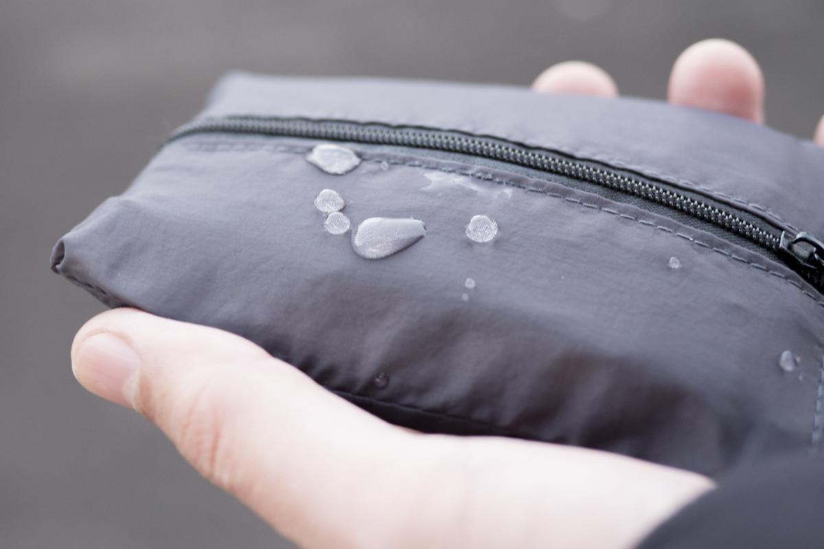 本体の生地にはナイロン素材が使われている為、試しに水をかけてみたところ染み込まず弾いてくれていました。