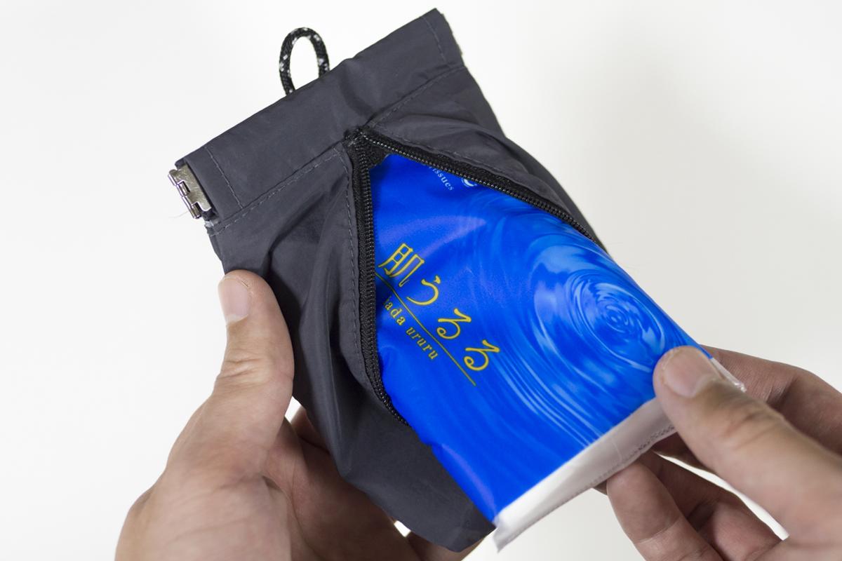 センターについているファスナーをあけてポケットティッシュを入れてみましょう。