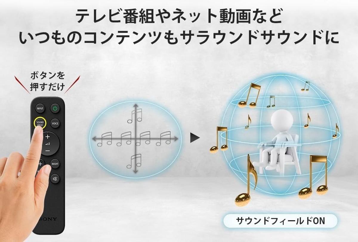 ここに加えて、ソニー独自の「サウンドフィールド機能」も搭載。これは再生中コンテンツの音声をリアルタイムで分析し、立体的なサウンドに変換してくれるスグレモノ。どんなコンテンツでも音に包まれる体験を味わうことができますよ!